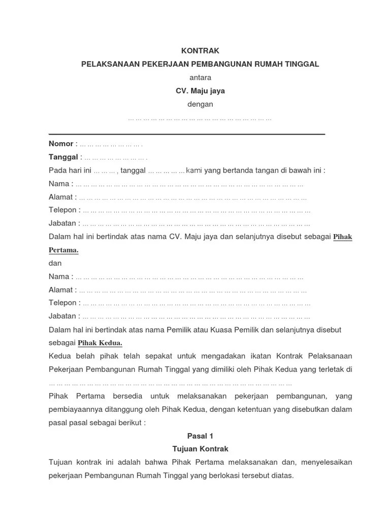 Berikut kami berikan informasi tentang contoh surat perjanjian pemborongan pekerjaan. Hal ini sesuai dengan pasal 3 dalam surat perjanjian : Hasil pekerjaan borongan bangunan tersebut harus sesuai dengan standar spesifikasi teknis dari pihak pertama seperti dalam lampiran . Surat perjanjian pemborongan / kontrak proyek pembangunan apartemen non hunian / condotel panorama bali resort & spa di. Nama dan alamat dalam contoh surat ini adalah . Untuk pekerjaan tersebut para pihak telah saling setuju dan sepakat dibayar oleh pihak. Kedua belah pihak beritikad baik untuk melaksanakan surat perjanjian pemborongan… Perjanjian kerja, perjanjian jual beli, perjanjian usaha bersama, perjanjian sewa, perjanjian pengangkutan, . Seperti dilansir dari berbagai sumber, surat perjanjian kontrak kerja atau spk akan mengikat kedua belah pihak yang sudah bersepakat.